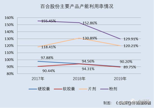据招股书,2017-2019年,百合股份粉剂产品的产能利用率分别为155.45%、152.86%、129.91%;片剂产品的产能利用率分别为118.41%、130.89%、120.21%;硬胶囊产品的产能利用率分别为97.88%、94.56%、90.2%;软胶囊产品的产能利用率分别为90.44%、94.31%、89.75%。