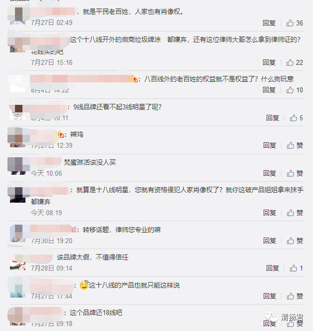 网友七:就算是十八线明星,您就有资格侵犯人家肖像权了?就你这破产品姐姐拿来抹手都嫌弃。