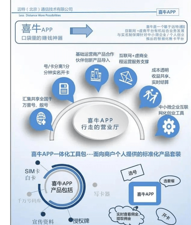 此外,中新观察注意到,远特时空(成都)通信技术有限公司(以下简称:远特公司)推出一款名为“喜牛”APP的软件,该软件自称耗资100万元打造的“互联网+合创共享移动平台,该公司对外宣传是工信部授权的电信增值业务提供商,于2014年获得工信部虚拟运营商牌照并发布移动转售业务品牌,致力于打造独特的移动通信多业务云端运营商。
