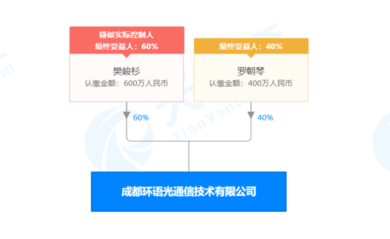 据天眼查显示,成都环语光通信技术有限公司成立于2018年9月27日,注册资本1000万元,樊峻杉担任执行董事兼总经理,占股60%,罗朝琴担任监事,占股40%。2020年6月8日,该企业由“远特时空(成都)通信技术有限公司”变名为“成都环语光通信技术有限公司”。