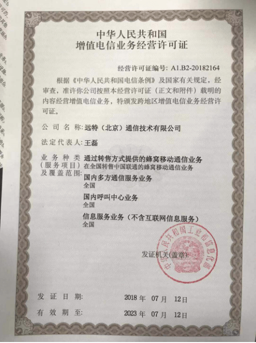 值得注意的是,据公开信息显示,2018年成立初期,“喜牛”与远特(北京)通信技术有限公司达成战略合作,实际上,远特(北京)通信技术有限公司是真正获得工信部颁发的虚拟运营商牌照。