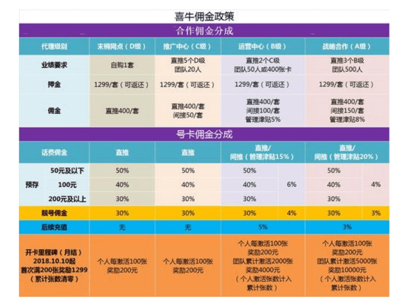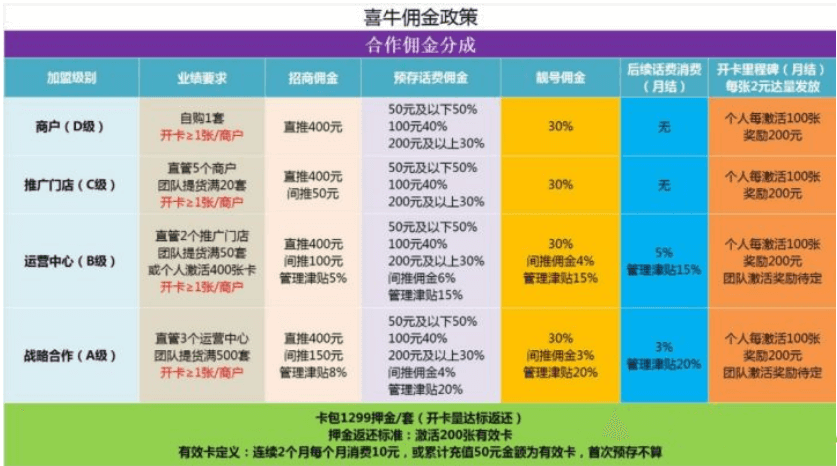 据悉成为喜牛APP会员需要缴纳1299元加盟费给公司,然后公司寄送代理商户的是一套专业卡包设备,包括一只手提包、蓝牙传输设备、50张白卡(没有写入电话号码)、数据连接线、红色条幅(全国百万靓号 任你选)、海报。