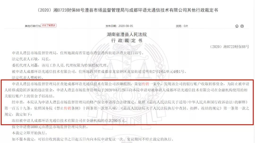据该《行政裁定书》显示,澧县市场监督管理局在查处成都环语光通信技术有限公司涉嫌组织、策划传销一案中,发现该公司的银行账户收取转移资金,为防止被申请人转移或隐匿涉案的违法资金,申请人澧县市场监督管理局于2020年6月29日向本院申请对被申请人成都环语光通信技术有限公司在金融机构使用的相关银行账户上的资金予以冻结。