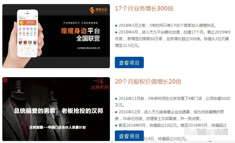 在天九共享集团的官网上的“独角兽孵化联营”中,罗列了很多该公司孵化的项目,比如嗖嗖身边平台、汉邦剪裁等等,但大多都是并不知名的项目。