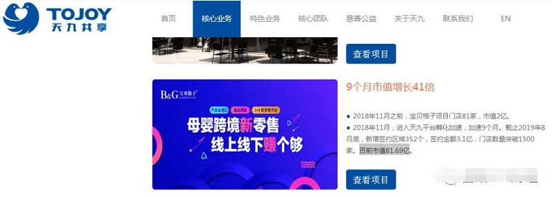 再来看天九共享集团孵化的一个母婴跨境电商项目,名为宝贝格子,这是个新三板挂牌公司,目前总股本1.12亿股、最近一次成交价为22亿元,对应总市值不到25亿元,但是在天九共享网站上,却标注“目前市值81.69亿”。