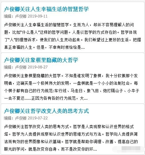 提到天九的董事局主席卢俊卿,就不得不提到“卢俊卿哲学网”。关于“卢俊卿哲学网”,其官网上的介绍标注:卢俊卿哲学网旨在弘扬国学文化,传承、推广和普及中华文化方面的文化常识。努力“打造数字化国学文化品牌,发 展老百姓(603883,股吧)关注的国学文化,倡导讲述你我个性的国学故事”,长期致力于国学文化产业在移动移动互联,手机应用, 等方面的积累和探索。但是,在这个网站上刊载的文章,也多是些没有实际内容的评论文章。