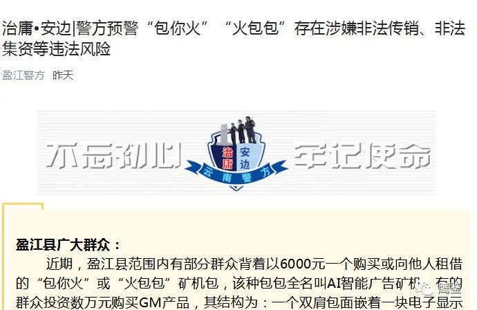 当天,盈江县公安局也通过其官方公众号发布了一条类似的风险提示。该风险提示中提到,近期,盈江县范围内有部分群众背着以6000元一个购买或向他人租借的“包你火”或“火包包”矿机包,该种包包全名叫AI智能广告矿机,有的群众投资数万元购买GM产品。