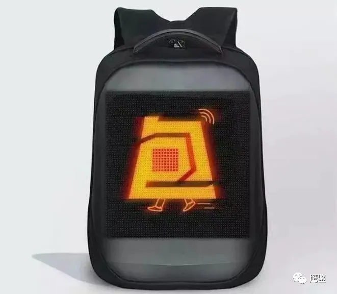 其结构为一个双肩包面嵌着一块电子显示屏,播放屏背面是一块电子集成器连接着一个充电宝,电子显示屏上显示相关广告内容,如:“包你火”、“火包包”、“德宏欢迎您”等广告。