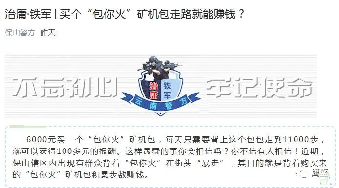 6000元买一个“包你火”矿机包,每天只需要背上这个包包走到11000步,就可以获得100多元的报酬。这样愚蠢的事你会相信吗?你不信有人相信!近期,保山辖区内出现有群众背着“包你火”在街头“暴走”,其目的就是背着购买来的“包你火”矿机包积累步数赚钱。