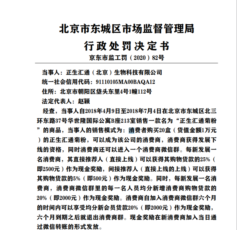 近日,中新观察注意到,北京市东城区市场监督管理局发布一则行政处罚决定书,该行政处罚决定书显示,当事人自2018年4月9日至2018年7月4日在北京市东城区北三环东路37号华世隆国际公寓B座213室销售一款名为“正生汇通菊粉 ”的商品。