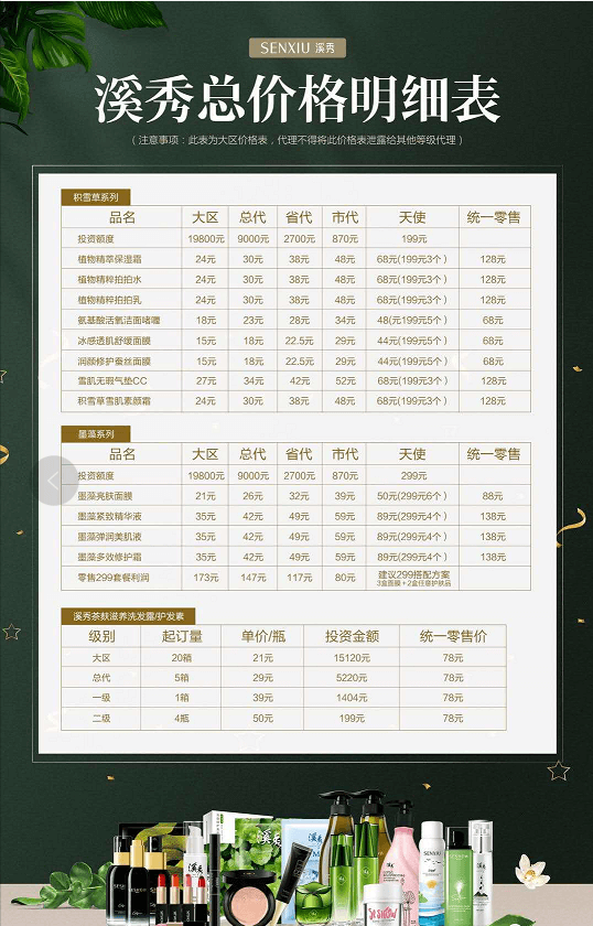 溪秀代理商提供的最新《溪秀总价格表明细》显示,目前溪秀微商团队是分产品系列招商的,积雪草系列和墨藻系列采用的是五级代理分销,洗护产品采用的是四级代理分销。