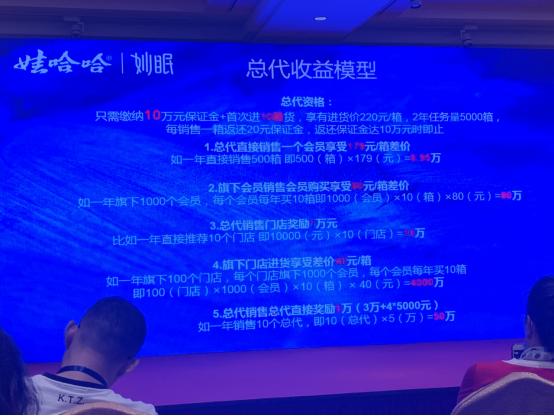 复杂层级的背后是利益的相互勾连,在娃哈哈妙眠多级别的营销系统中,层级间的收益令人眩目,仅靠一些文字资料想快速厘清并不是一件容易的事,倒是娃哈哈妙眠营销人员在多个场合展现的图文则要清晰的多。