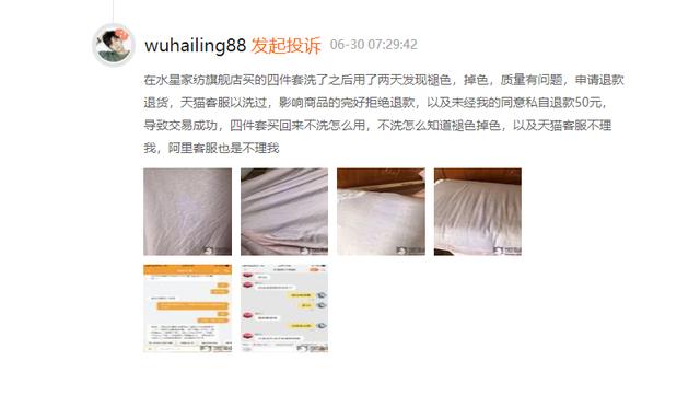 中新观察还在黑猫投诉上发现,诸多消费者反映最多的问题是,在水星家纺天猫旗舰店购买的产品出现的产品质量问题以及虚假宣传等问题较多。此外,据公开报道显示,2012年至2017年,水星家纺的产品曾多次抽检不合格,如:2016年12月,内蒙古自治区工商局官网公布当年流通领域床上用品商品质量抽检结果,标称上海水星家用纺织品股份有限公司生产的“春日布兰姆”、“枫丹白露”等床上用品不合格;2017年1月,江苏省工商局发布2016年网络交易纺织服装类商品质量抽检结果,其中也有水星家纺的产品。