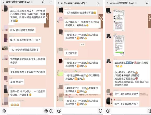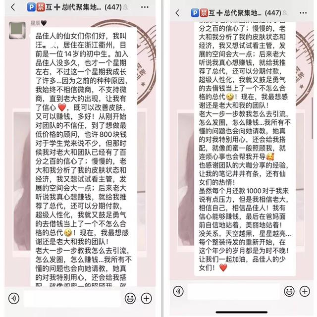 今年7月,14岁女孩“一天能作词300首,诗2000首,每天写15000字小说”的新闻上了热搜并遭到主流媒体普遍质疑。然而,“神童”背后却是父母花了18万元拜所谓“成功学”大事姬剑晶为师,而这所谓的成功学与传销洗脑的话术如出一辙。近日,有网友跟中新观察反映一家名为“品佳人”的微商平台采用“三级分销+多级分销”的模式发展市场,在相关代理商宣称的躺着赚钱诱导下,一位14岁的未成年女孩则也加入其中。