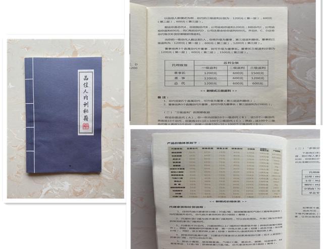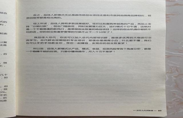 此外,该网友给本网提供了大量的截图显示,品佳人还出了一本“品佳人内训秘籍”,里面包含品佳人的三级分销返利模式,还有各种拉人的话术以及应对各种可能出现问题的办法。还有所谓的低投资,赚百万的宣传手册。“她们想让你相信只需要投资1.5万元就可以实现年赚百万的梦想以及月入十万不是梦这样的话术都打印在宣传手册里面。”该网友说道。