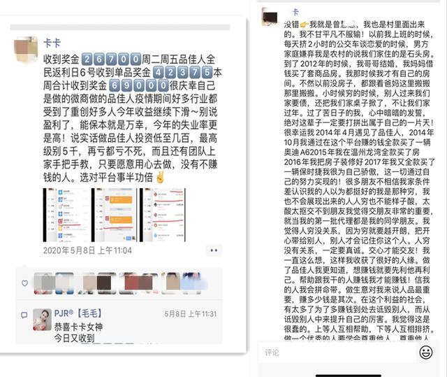 相比各种话术,品佳人的“成功学”洗脑课可谓是绵里藏针。“她们所谓的成功故事是讲给未加入的人听,同时让你私聊身边的朋友有没有兴趣创业,并且告诉你不要不好意思,大家把好的商机分享给他们一起赚钱,一起致富,实际上是一种洗脑,洗脑也分为多种,一种是聊天洗脑,还有一种朋友圈洗脑,比如咨询你的人是宝妈,那你朋友圈就发宝妈做品佳人赚钱的案例;假如是学生,就发学生做品佳人赚钱的案例,品佳人公司高层群经常发一些各行各业的人加入品佳人来诱导其他人加入,如果没有这样的案例,就要自己编故事,编一个这样的故事去吸引新人,最终目的就是拉新人做品佳人。”