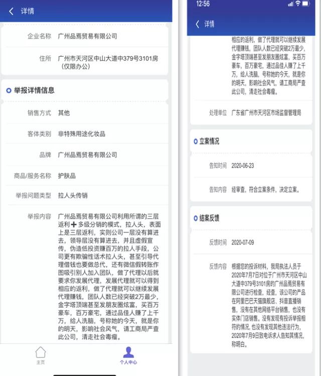 此外,据该网友透露,品佳人还发展14岁的女孩借钱上总代的实例。为此,该网友于今年6月23日,实名举报了广州品焉贸易有限公司涉嫌传销。7月9日,该网友接到广州天河区市场监督管理局的电话,称其单位去广州品焉贸易有限公司(注册地址:广州市天河区中山大道中379号3101房)检查未发现,除了天猫旗舰店和抖音直播还有其他销售平台。
