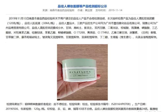 中新观察还注意到,2019年11月14日,南昌市食品药品检验所官网发布了《品佳人裸妆面膜等产品检测超标公示》。公示显示,该所对品佳人清肌控油泥膜(120克/瓶)、品佳人肌底液(30ML/瓶)、品佳人壹品水、品佳人裸妆面膜等四款产品进行了抽样检测。检测结果显示:“品佳人清肌控油泥膜”中检出了“铜绿假单胞菌”这项“不得检出”的成份,同时还发现“汞、铅、砷、镉”等10项重金属和有毒物质不合格;“品佳人裸妆面膜”检测发现“菌落总数超限量值24倍”,同时发现了“酮康唑”这项“不得检出”的成份。