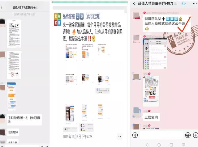 “品佳人群聊经常宣传并鼓励新人加入,为此,不少新人刷花呗、借呗、信用卡等上总代,并暗示别人只要想加入,借钱也要做。”据该网友透露:“当你花钱上了总代之后,她们就会教你如何在微信朋友圈去吸引陌生人,把货如何推销出去,相对卖货,拉人头返利是比较重要的,甚至她们会告诉你,零售不赚几个钱,最重要的是组建团队,去给别人洗脑,并且把自己的洗脑方法分享给群里其他的人。”