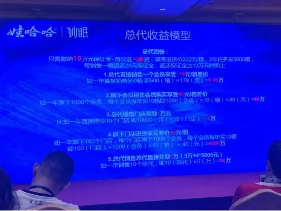 复杂层级的背后是利益的相互勾连,在娃哈哈妙眠多级别的营销系统中,层级间的收益令人眩目,仅靠一些文字资料想快速厘清并不是一件容易的事,倒是娃哈哈妙眠营销人员在多个场合展现的图文则要清晰的多。