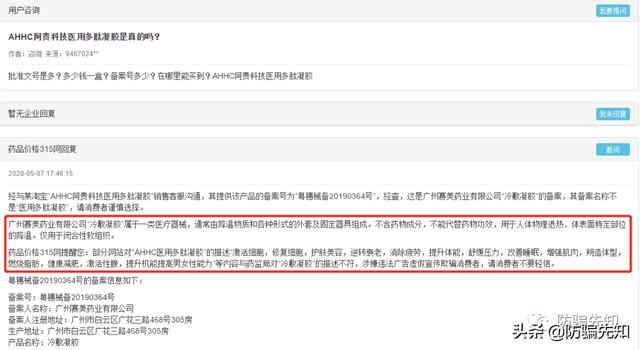近日:防骗先知接到网友举报,今年3月以来,湖南阿贵科技有限公司(湖南安化县,专门经营安化黑茶),在网络上设置一个平台,经营”冷敷凝胶”,宣传称:这款”多肽冷敷凝胶”,由阿贵科技有限公司与广州中医药大学科研团队合作研发,提取黑茶精华及十几种名贵中药材制造而成,凃在人体皮肤上,10秒钟透皮吸收,20秒钟进入血液,3分钟转换为能量,激活人体细胞组织,对人体各种疾病起调理作用,有病治病,无病养身。