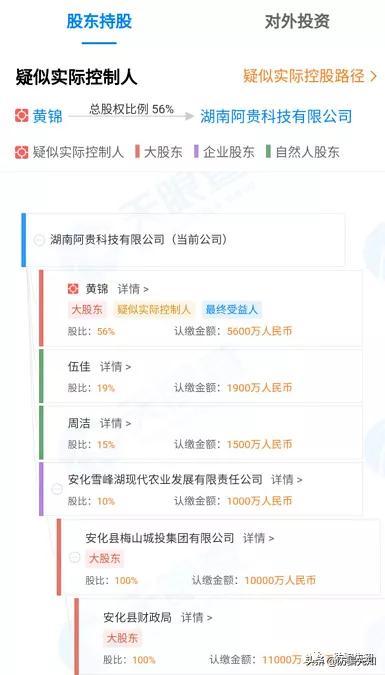 据悉:湖南阿贵成立于2019年6月6日,注册资本一个亿,实缴资本0元,股东为黄锦、周洁、伍佳、安化雪峰湖现代农业发展有限责任公司,由雪峰湖现代农业公司出资1000万元、(土流网) 董事长伍勇出资1900万元,为控股股东、(湖南高马二溪茶业公司)董事长李忠出资1500万元,其他5600万元为李忠老婆出资。