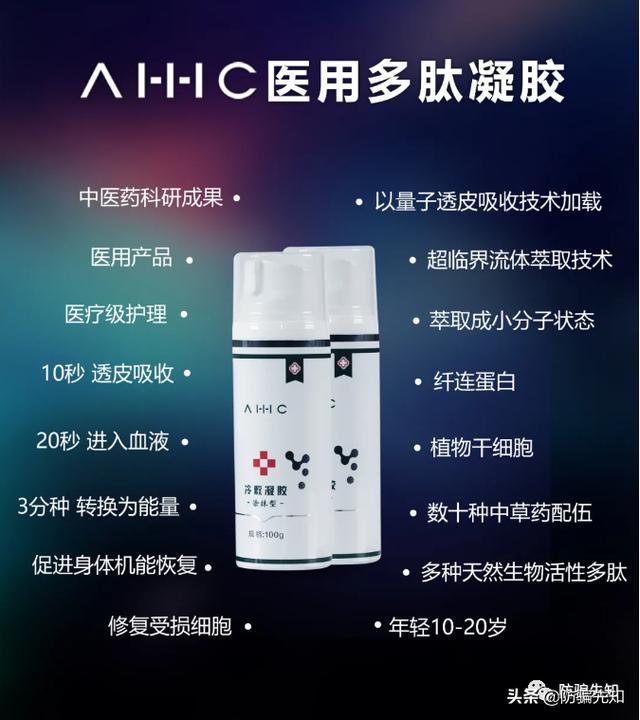 在代理的宣传中:AHHC医用多肽凝胶:调理亚健康,逆龄青春,重返青春,延缓衰老,就是涂抹一下手腕这么简单!一款产品功效覆盖保健品,护肤品,微整美业,不用吃也不用喝,更不用打针,就早晚涂抹手腕10-20秒,调理亚健康!提升免疫力!3-6个月年轻5-20岁。