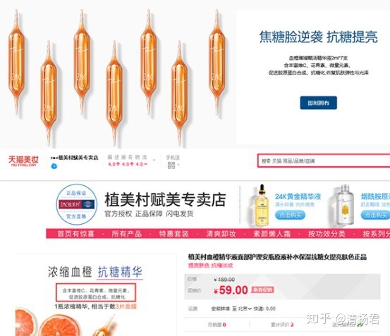 除此之外,天猫平台的“zmc植美村赋美专卖店”也有宣传“含丰富维C、花青素、微量元素,促进胶原蛋白合成、抗糖化”的宣传。