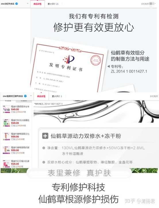 天猫平台的zmc植美村江麒专卖店 也在宣传“专利号ZL 201410011427. 1”、“专利修护科技,仙鹤草根源修复损伤”。