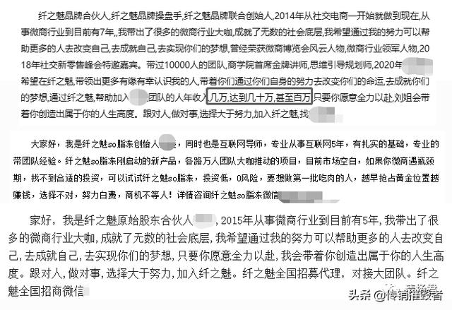 在网络上,有很多关于纤之魅微商的推广软文,里面基本上都会提到类似“投资低,0风险”、“带你年入几十万几百万”、“改变自己、实现梦想”之类的说辞。