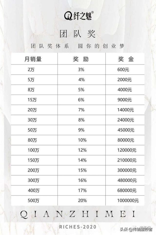 月销量2万到500万,奖励比例递增,从3%到20%,月销量500万奖金可达100万。