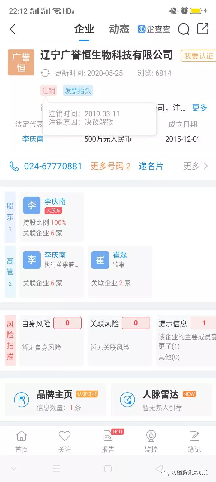 而李庆南在之后成为了辽宁清晨生物股东之一,同时在2019年3月份李庆南注销了,辽宁广誉恒生物科技有限公司