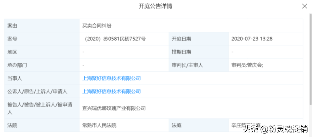 据天眼查显示,宜兴市瑞优娜玫瑰产业有限公司成立于2017年7月13日,实缴资本为330万元,吴志忠担任法人、执行董事与总经理,张娟担任监事。此外,社交财经还注意到,2020年7月23日,由徐之伟担任法人的上海聚好信息技术有限公司因“买卖合同纠纷”起诉了宜兴瑞优娜玫瑰产业有限公司。