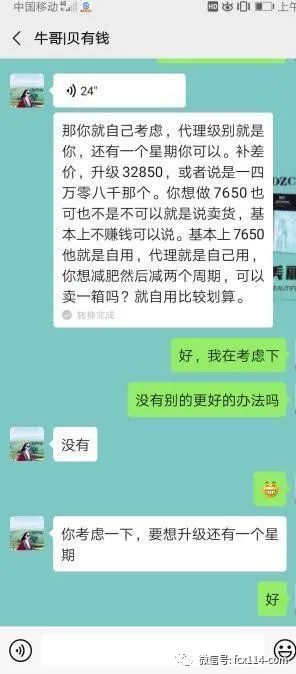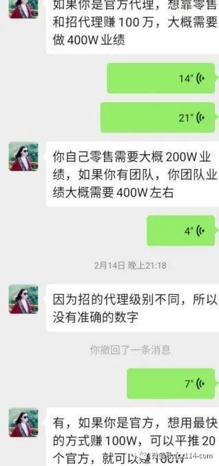 在客户缴纳了7650元成为一级代理后,李贝贝会让代理加上助理牛哥的微信,牛哥来讲解各级别的利润点,一个基础代理想要快速挣到100w,纯靠零售需要大概200w的业绩,也就是700箱代餐粉,利润是最低的。而更快速简单的方法是成为最高级别官方代理,据牛哥讲解,成为官方级别后,只需要拉到20个同样的官方代理,就能轻松的挣到100w的利润差,然而成为官方级别的门槛是需要一次性缴纳代理费252000元,诱惑不止如此,官方代理还具有获得补货返利和业绩分红的资格。