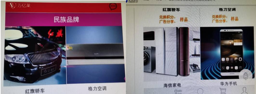 请注意看上面第二张图上面用小字标明了,这些东西(实际是假的,有照片没真货)必须用广告积分才能购买,所谓广告,就是指的拉人头进入万亿莱投钱。