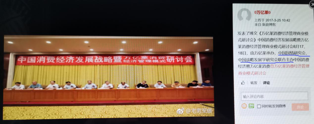 当时的“万亿莱”的宣传通稿上写着:(国务院二招的这个会)承办方还是万亿莱物联网公司,主办方是中国国情研究会和中国战略发展学研究会,参与研讨会的有中纪委、国务院、商务部的领导和专家,他们一致对“万亿莱”经营模式予以肯定。可以断定,这种宣传存在很大的虚假成分。一个才成立20天的公司,谁会来肯定其经营模式?靠什么业绩来肯定他的经营模式?