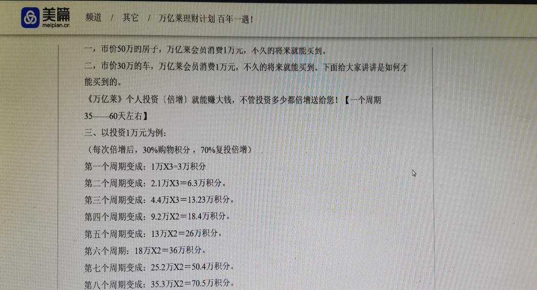 投进去钱的人很快就明白了,一是积分翻倍没有用,“万亿莱”网上商城里的红旗轿车、格力空调、海信家电、华为手机、玉石首饰等商品都是假的,商城里面根本就没有真货! “万亿莱”没有和任何一家国货厂家有过订货合同或者进货意向。这是一个完全欺骗性的假商城!万亿莱公司在张茂龙和孙建国为实际控制人期间,没有进任何商品可用来和会员交易,不构成“网上商城”和会员之间的买卖关系。二是所谓的积分倍增是有前提的,网上第二篇揭露文章已经提到,当你第一个周期投入钱以后,如果不在这个周期内拉上7—11人投钱进来,后台就会把你的积分倍增卡死,以下的周期如数类推。不但倍增积分不可能,你投进去的钱也不可能变现退还给你!