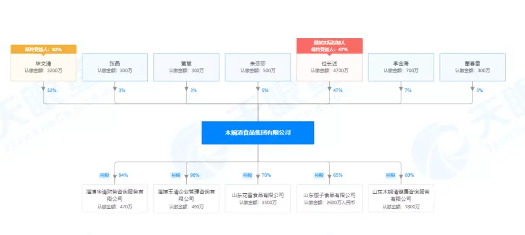 据天眼查显示,木婉清食品集团有限公司成立于2015年12月17日,实缴资本为1984.68万元,位长述担任法人、执行董事兼经理。其中,位长述占股47%,毕文清占股32%。此外,2017年8月18日,山东木婉清食品有限公司变更为山东木婉清食品集团有限公司;2018年1月3日,山东木婉清食品集团有限公司更名为木婉清食品集团有限公司。