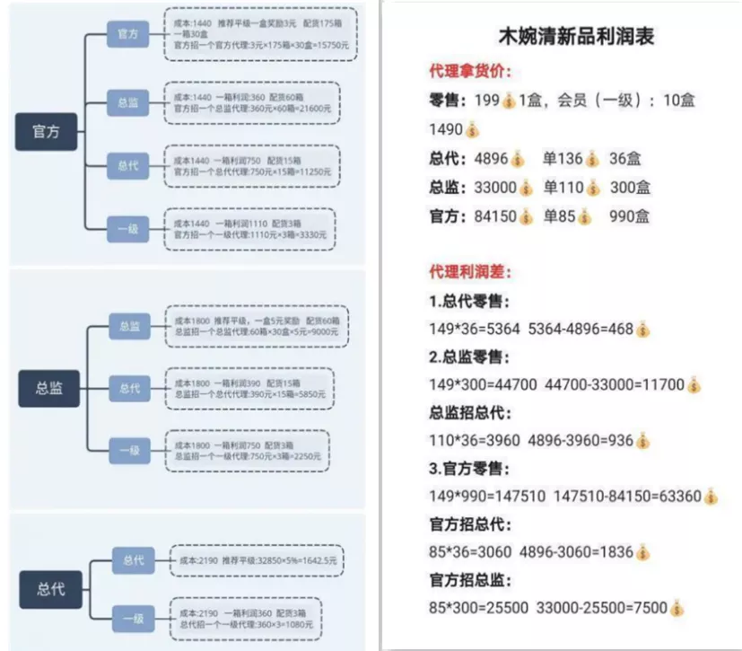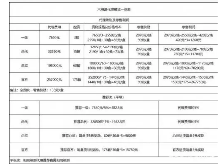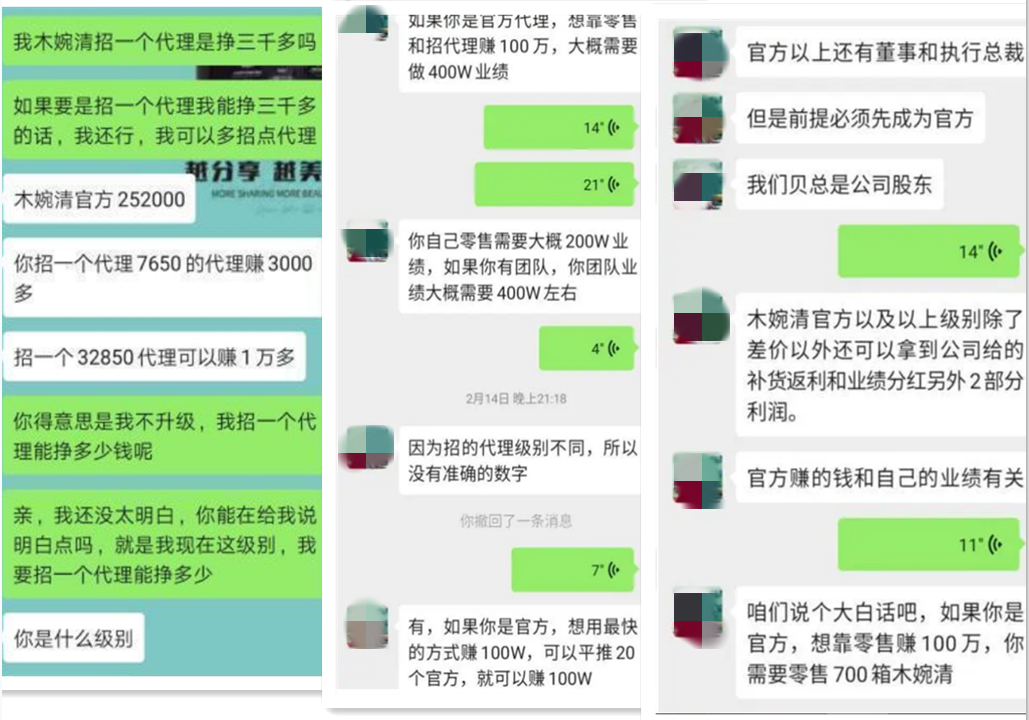 “木婉清的代理有四个级别:一级、总代、总监、官方,官方以上有董事和执行总裁。”张权透露道:“在客户缴纳了7650元成为一级代理后,李贝贝会让代理加上助理牛哥的微信,牛哥来讲解各级别的利润点,一个基础代理想要快速挣到100w,纯靠零售需要大概200w的业绩,也就是700箱代餐粉,利润是最低的,而更快速简单的方法是成为最高级别官方代理,据牛哥讲解,成为官方级别后,只需要拉到20个同样的官方代理,就能轻松的挣到100w的利润差,然而成为官方级别的门槛是需要一次性缴纳代理费252000元,诱惑不止如此,官方代理还具有获得补货返利和业绩分红的资格。”