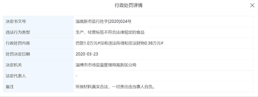 2020年3月23日,木婉清公司因“生产、经营标签不符合法律规定的食品”被淄博市市场监督管理局高新区分局罚款1.0万元并没收违法所得和非法财物0.36万元。