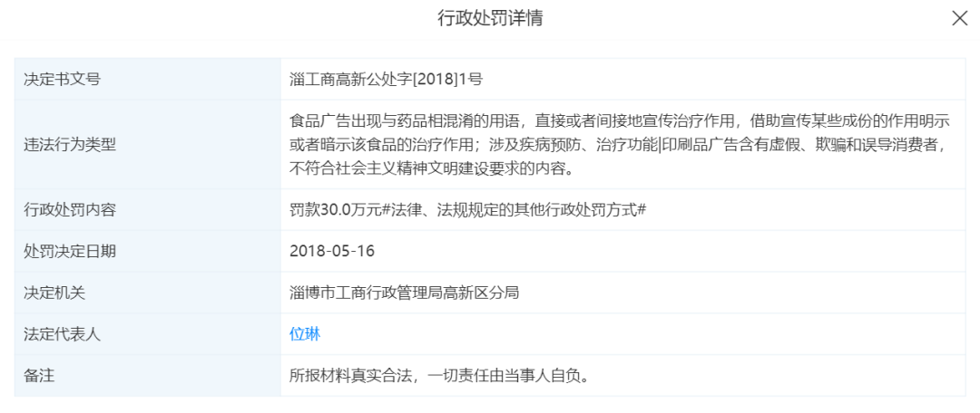社交财经还注意到,2018年5月16日,木婉清公司因广告违法行为遭到淄博市工商行政管理局处以30万元的罚款。处罚详情中写道:食品广告出现与药品相混淆的用语,直接或者间接地宣传治疗作用,借助宣传某些成份的作用明示或者暗示该食品的治疗作用;涉及疾病预防、治疗功能|印刷品广告含有虚假、欺骗和误导消费者,不符合社会主义精神文明建设要求的内容。