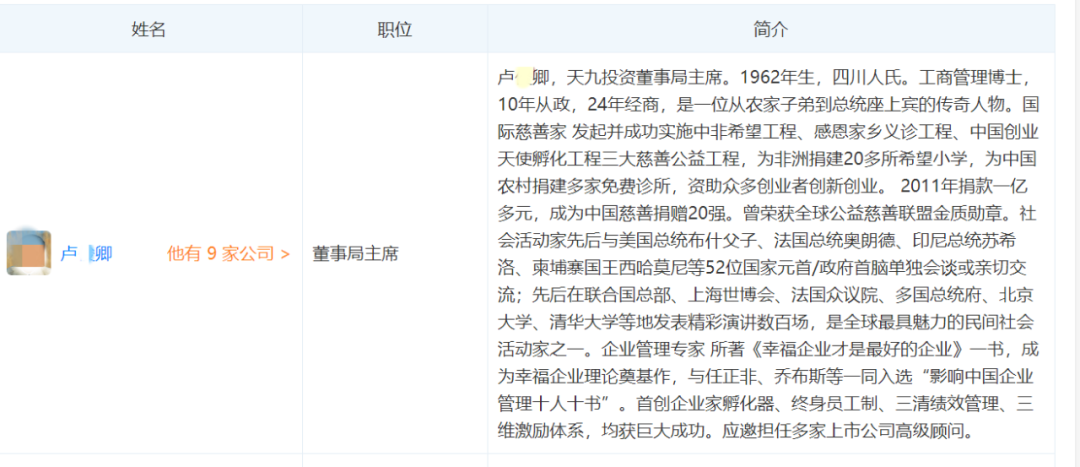 此外,公开信息还显示,天九是知名的国际慈善企业,2011年荣登中国慈善捐赠百强榜20强,董事局主席卢某卿荣膺“改革开放40年中国最具影响力十大公益人物”。