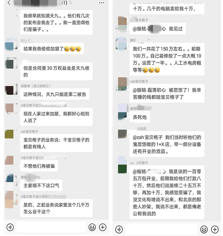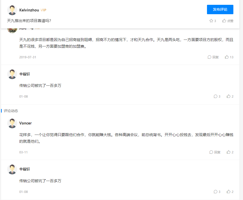 此外,据相关投诉人透露,天九共享集团自称使命是为企业加速、让伙伴幸福,但其实只是把大家的钱加速装到自己兜、成就了它自己的幸福,股东们的钱无形中只不过是变成了进门赋能的门票而已。其次,天九的商业模式从开始搞定增的接连失败,到现在以招商的形式、行 " 圈钱 " 的实质,不给股东回报;再次,天九的盈利模式一是招商圈钱,十个招来九个死;二是圈钱收点数还要股权;三是孵化项目,谎称股东赚到了很多钱,其实根本就是睁眼说瞎话。此外,天九说的话,几乎都是空头支票,没有任何落实的可能性,所谓得道多助平台,其实卢某卿属于圈钱就走的类型,让根本不顾及其他股东的死活。