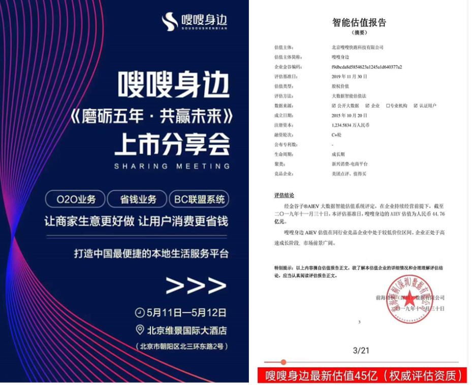 据悉,天九共享集团旗下有多个项目遭到投诉与质疑。以“嗖嗖身边”为例,公开信息显示,"嗖嗖身边"是 一款O2O生活APP,整合了包括美业、出行、外卖、经纪、修理、家政、家教、休闲、购物等日常生活服务项,类似于58同城平台。从华为手机商城显示的数据,截止到目前“嗖嗖身边”APP累计下载量为282万次,同日58同城的类似下载量为15亿次,差距非常明显。在这样的背景下,天九共享在其官网上描述道:“估值从2亿元暴增至32.5亿元。”