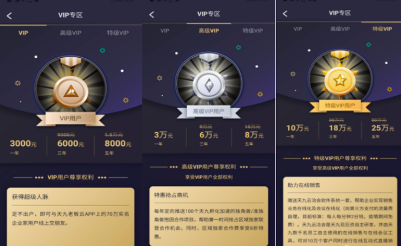 以及免费在线招商,免费出席“中国独角兽商机共享大会”等;高级VIP:一年3万元;两年6万元(原价9万元);三年8万元(原价15万元),福利:与天九老板云APP上的70万名实名企业家用户线上交朋友。每年定向推送100个天九孵化加速的独角兽/准独角兽抱团合作项目。区域独家合作费享受8折优惠以及成为天九儒商大学学员、低价采购商品、免费在线招商、免费出席“中国独角兽商机共享大会”等;特级VIP:一年10万元;三年18万元(原价30万元);五年25万元(原价50万元)。除细则外,与高级VIP类似。