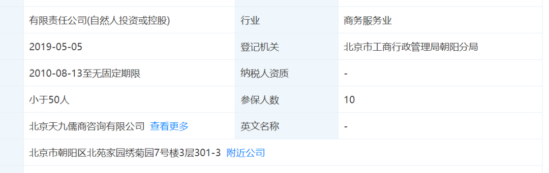 据天眼查显示,天九共享控股集团有限公司(曾用名:北京天九儒商咨询有限公司)地址是北京市朝阳区北苑家园绣菊园7号楼3层301-3,据相关人士透露,该公司的注册地址就是一个建成于1999年的老小区。那么,一个号称是“成功加速100多家独角兽企业和准独角兽企业”,创始人“应邀担任多家上市公司高级顾问”的公司,为什么只是一个委身于老小区、只有10个员工的公司?