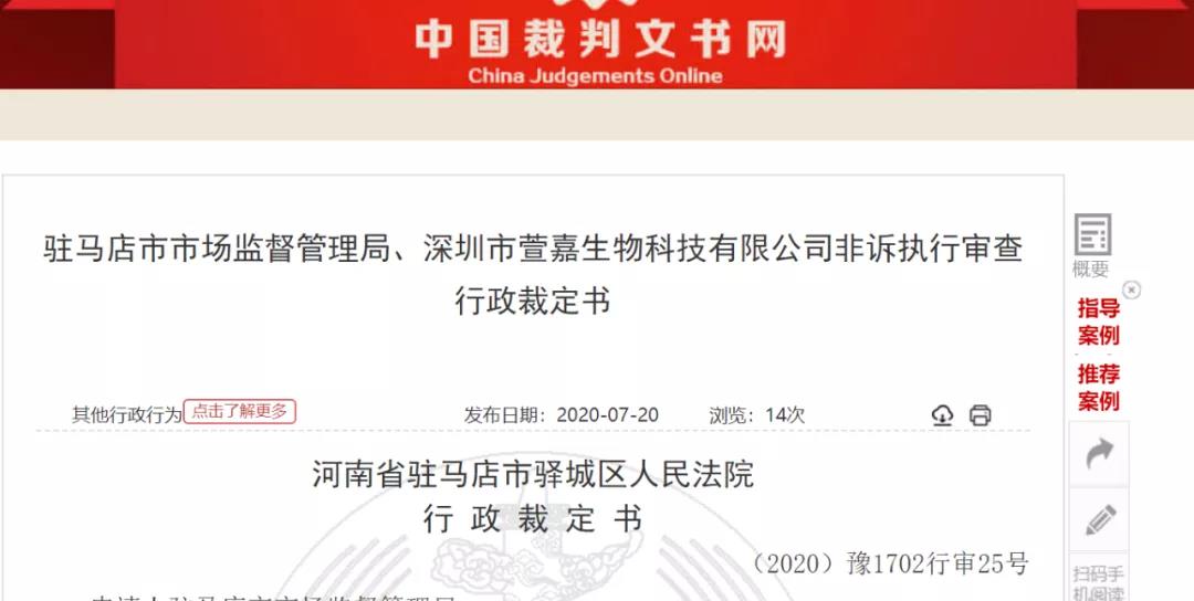 不久前,中新观察在中国裁判文书网注意到一则题为《驻马店市市场监督管理局、深圳市萱嘉生物科技有限公司非诉执行审查行政裁定书》(以下简称:《行政裁定书》)。