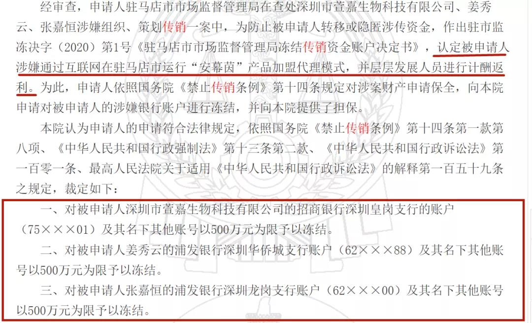 “安幕茵”涉嫌传销:深圳市萱嘉生物科技有限公司被冻结1500万元