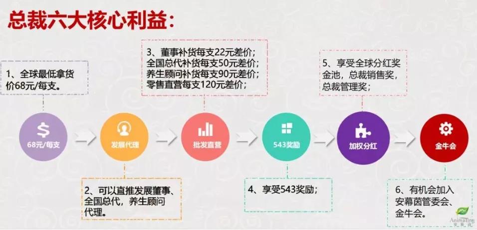 而赚钱最快的方式就是成为总裁级别代理,按照安幕茵现行的制度,找到5个(之前为3个)董事级别的人,就可以升级为总裁,并可以获得六大利益:差价(全球最低拿货价68元/每支);发展代理(可以直推发展董事、全国总代,养生顾问代理);董事补货每支22元差价;全国总代补货每支50元差价;养生顾问补货每支90元;差零售直营每支120元差;享受543奖励;享受全球分红奖金池,总裁销售奖,总裁管理奖; 有机会加入安幕茵管委会、金牛会。