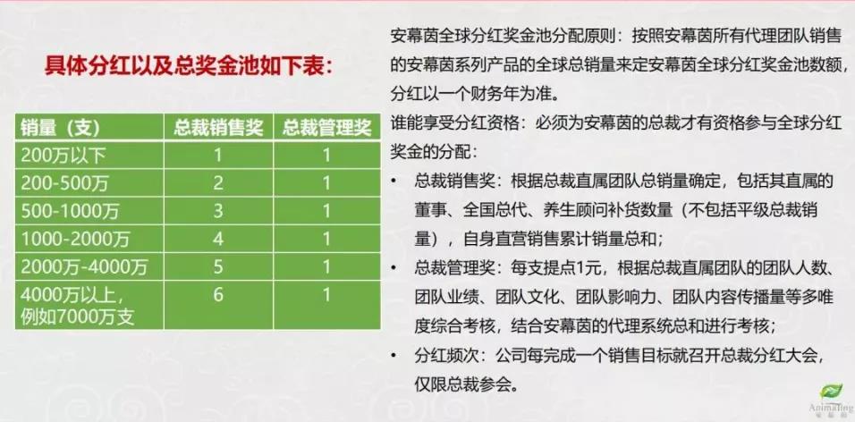 此外,总裁级别代理还享受全球分红奖励、销售奖与管理奖等,而据一位安幕茵经销商表示:“很多人已经把这当做一个事业来做,200万支,培养2000多个总裁就可以完成,我国14亿人口,找到2000个老鹰还不容易啊。”